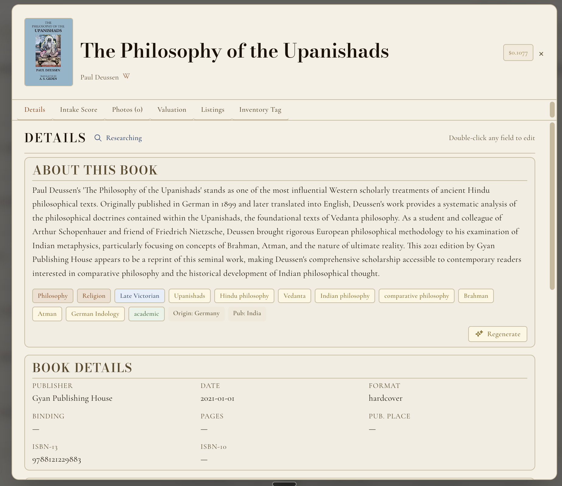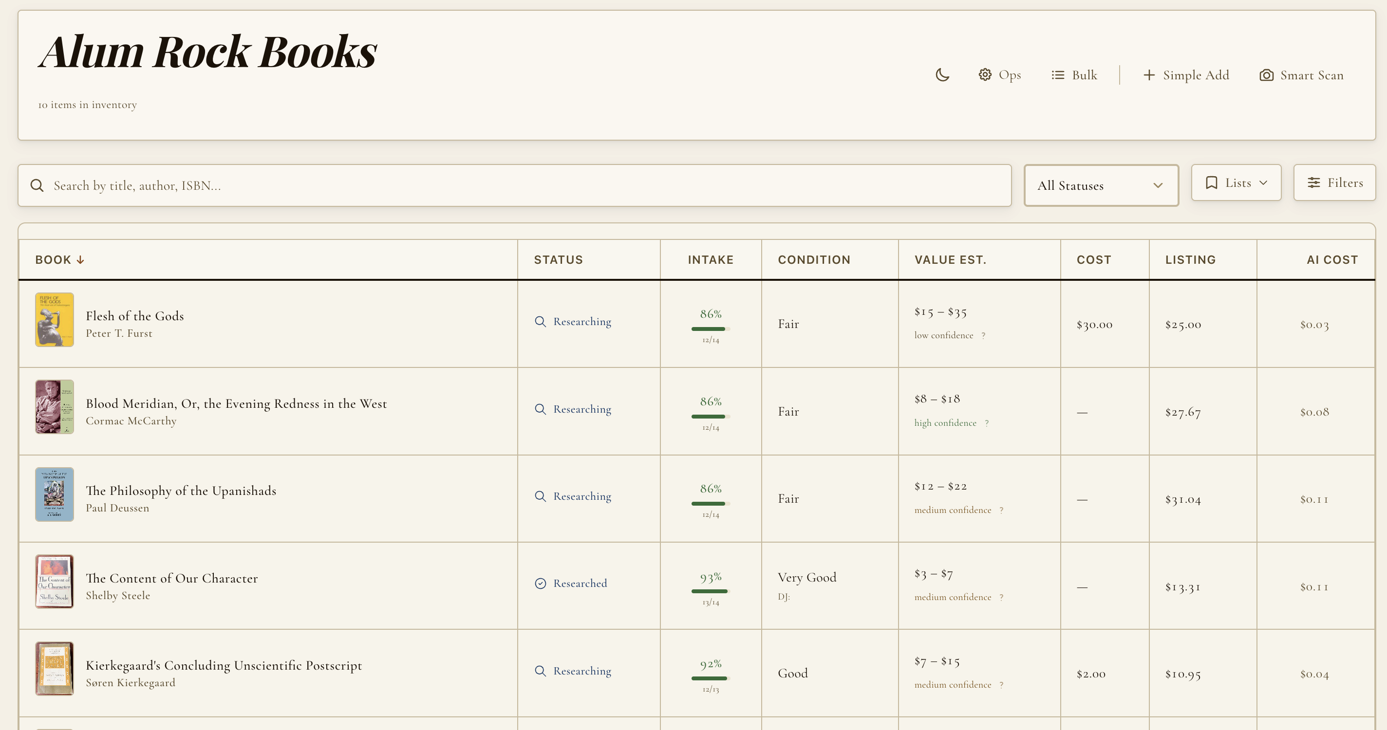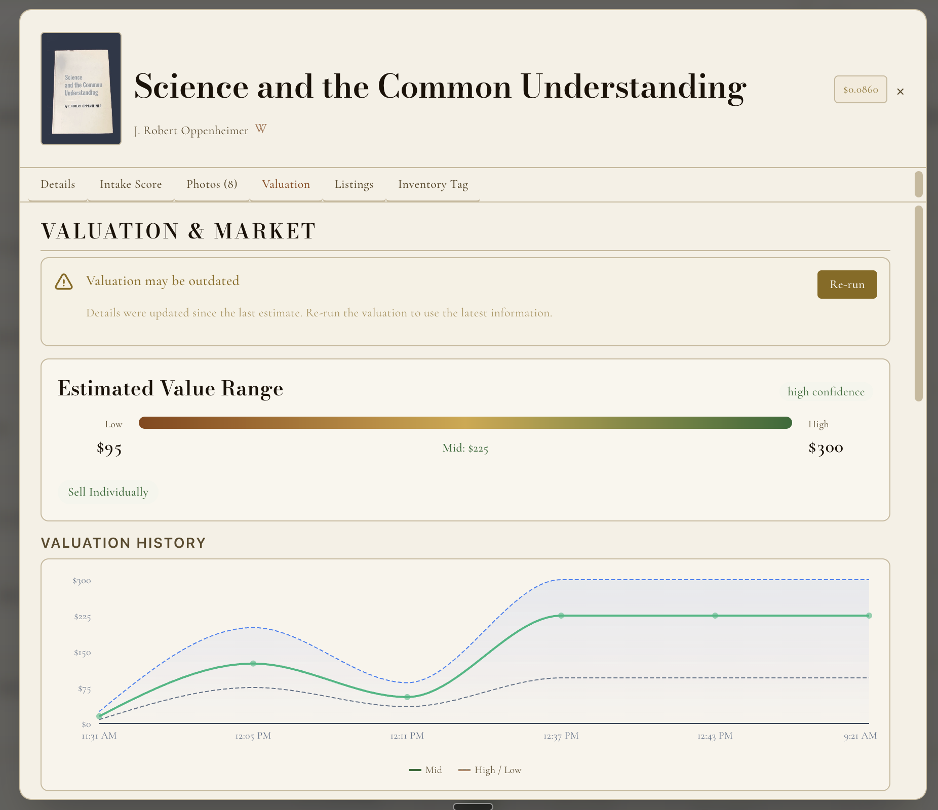 End-to-end book-flipping business tool: video scan a book, AI extracts frames and identifies it, voice narration sets condition and grading, Claude generates valuations and listing descriptions, then pushes to eBay via API. Built for pre-ISBN, pre-barcode rare books where traditional scanners fail.