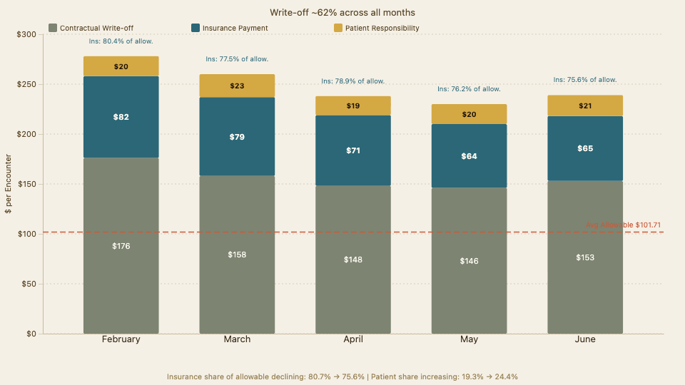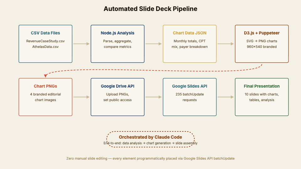 A fully automated presentation built entirely by Claude Code — from raw CSV data to a polished 17-slide Google Slides deck with D3.js charts, Sankey diagrams, and waterfall analyses. Zero manual slide editing: 6,230 encounter records parsed, analyzed, visualized, and assembled via 900+ Google Slides API requests.