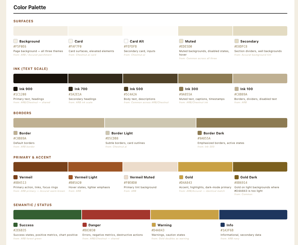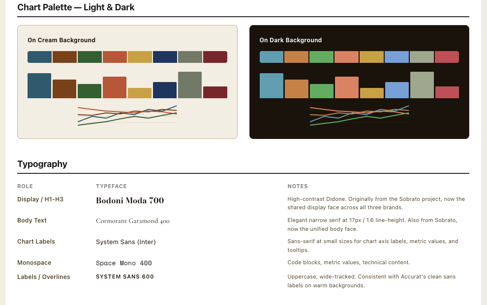 A living design system comparison across three brands — Sobrato, LumiLexicon, and Chestnut.ai. Side-by-side analysis of typography, color palettes, chart colors, icons, and UI elements, with a synthesized unified proposal inspired by Accurat's La Lettura visualizations and 19th-century ethnographic art.