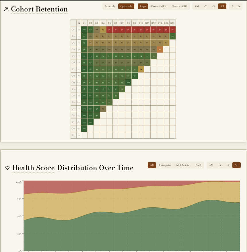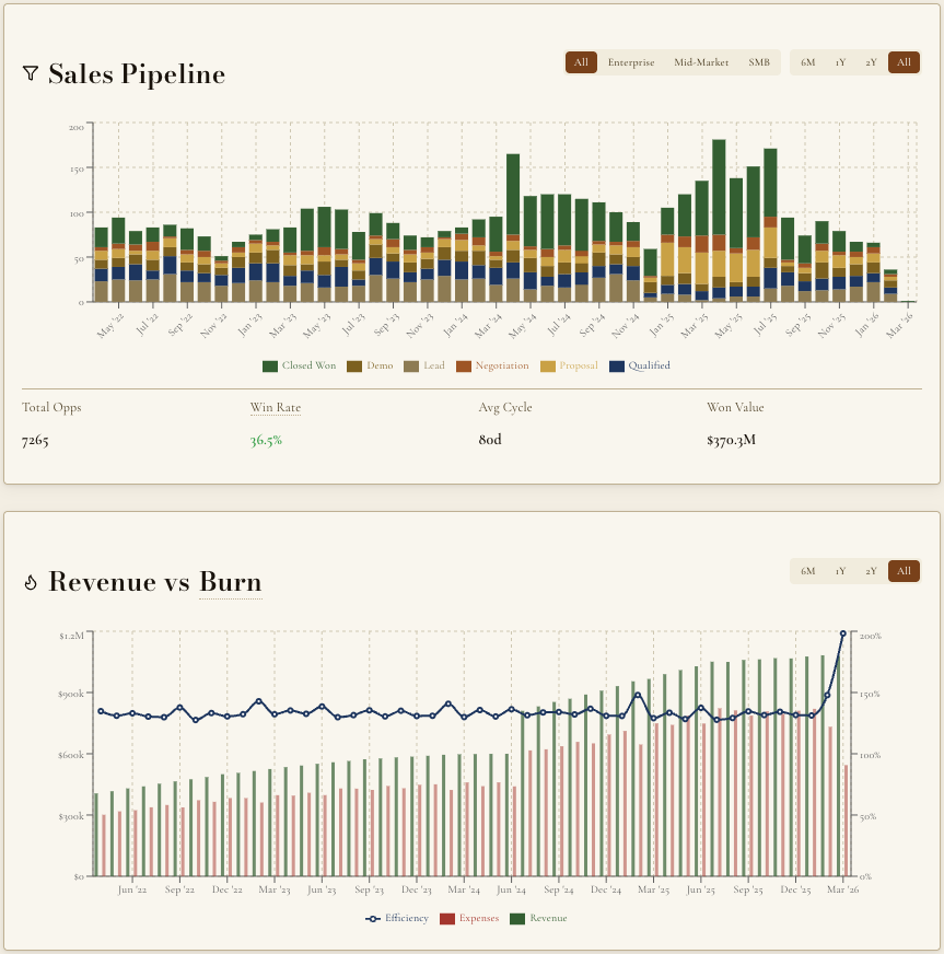A complete analytics platform showcasing revenue, customer health, churn, and operational metrics — the kind of dashboards I build for real companies. 35+ live metrics from Supabase PostgreSQL, 80+ API endpoints, Observable Plot charts, and a development log documenting every major build session.