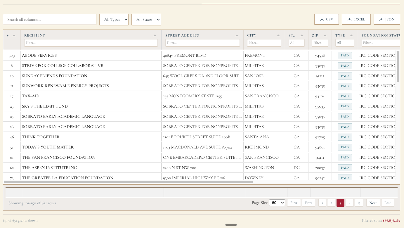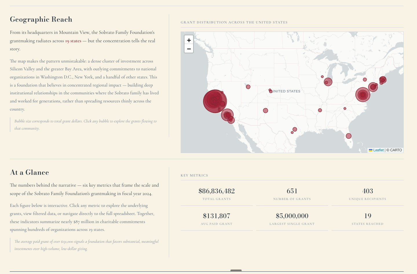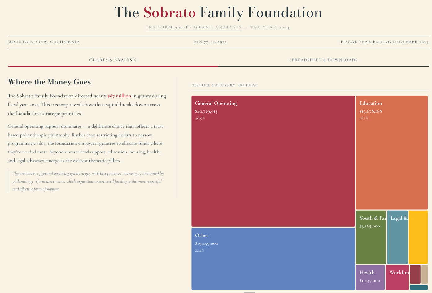 Search any nonprofit by name or EIN and explore their IRS filing data — revenue, expenses, balance sheets, officer compensation, grant recipients, and distribution compliance. Parses raw 990-PF XML from ProPublica into interactive D3.js visualizations with Leaflet maps and full spreadsheet export.